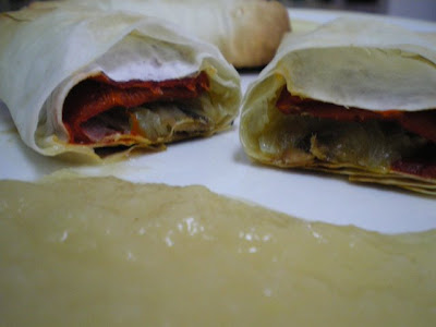Cortar la cebolla en juliana finita y pochar con el aceite , cortar el puerro y pochar con el vino blanco y el caldo , cuando haya reducido , añadir la ct de maicena , que previamente se ha diluido en un poco de agua .Cortar en dos las hojas de la pasta filo y poner un pimiento , un poco de cebolla y un filete de anchoa , finalmente enrollar .